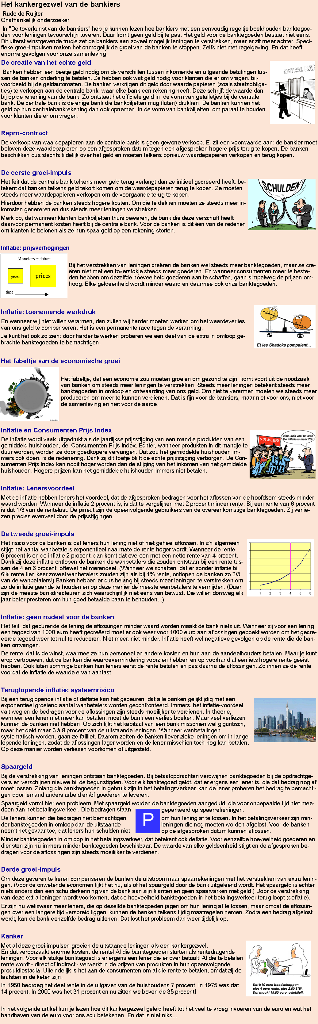 Het kankergezwel van de bankiers Rudo de Ruijter In "De toverkunst van de bankiers" heb je kunnen lezen hoe bankiers met een eenvoudig regeltje boekhouden banktegoeden voor leningen tevoorschijn toveren. Daar komt geen geld bij te pas. Het geld voor de banktegoeden bestaat niet eens. Dit uiterst winstgevende trucje zet de bankiers aan zoveel mogelijk leningen te verstrekken, maar er zit meer achter. Specifieke groei-impulsen maken het onmogelijk de groei van de banken te stoppen. Zelfs niet met regelgeving. En dat heeft enorme gevolgen voor onze samenleving. De creatie van het echte geld Banken hebben een beetje geld nodig om de verschillen tussen inkomende en uitgaande betalingen tussen de banken onderling te betalen. Ze hebben ook wat geld nodig voor klanten die er om vragen, bijvoorbeeld bij de geldautomaten. De banken verkrijgen dit geld door waarde papieren (zoals staatsobligaties) te verkopen aan de centrale bank, waar elke bank een rekening heeft. Deze schrijft de waarde dan bij op de rekening van de bank. Zo ontstaat het officiële geld in de vorm van getalletjes bij de centrale bank. De centrale bank is de enige bank die bankbiljetten mag (laten) drukken. De banken kunnen het geld op hun centralebankrekening dan ook opnemen in de vorm van bankbiljetten, om paraat te houden voor klanten die er om vragen.